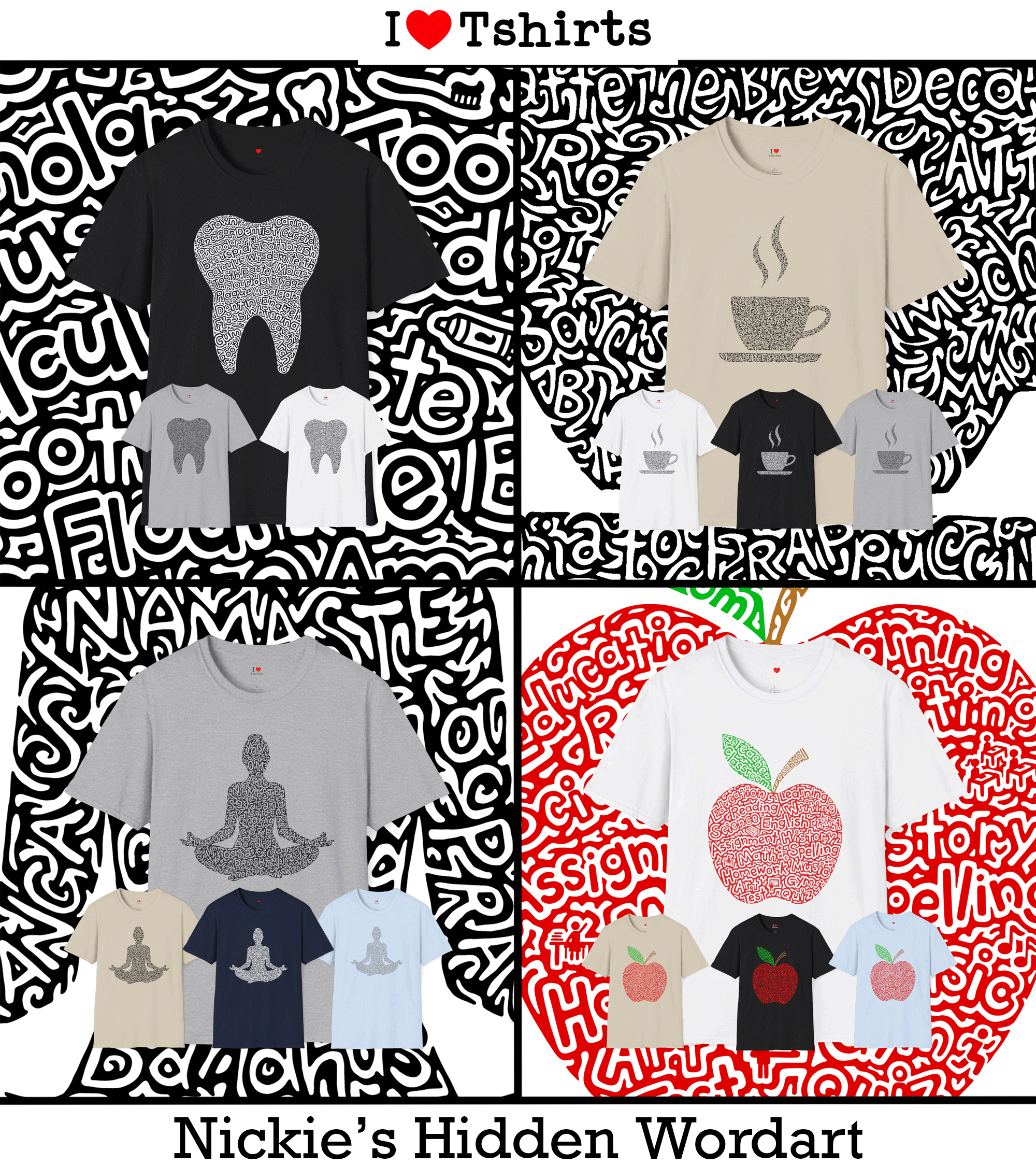 I Heart Tshirts is a small business where my husband and I draw our own tshirt designs. “Nickie’s Hidden Wordart” is a style where I doodle inside a shape or logo and hide associated words and pictures within the doodle. “Scott Sketches,” has his own detailed style of drawing characters which has translated into tshirt designs perfectly. Our unique and creative designs are only available through I Heart Tshirts!